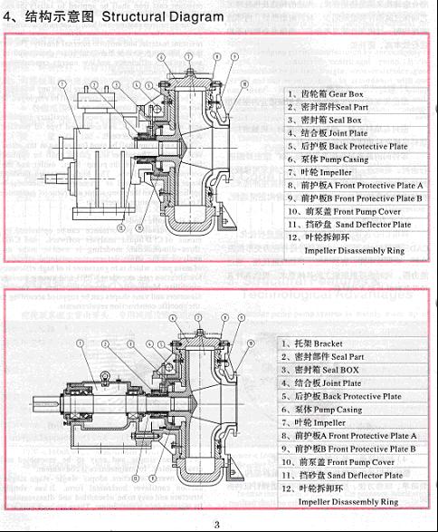 200TWN-500TWN型泵采用單泵殼、單級單吸懸臂臥式結(jié)構(gòu),按齒輪箱的連接方式均可提供兩種典型結(jié)構(gòu),即自帶托架式與泵箱合一式,自帶托架式潤滑方式為脂潤或稀油潤滑。